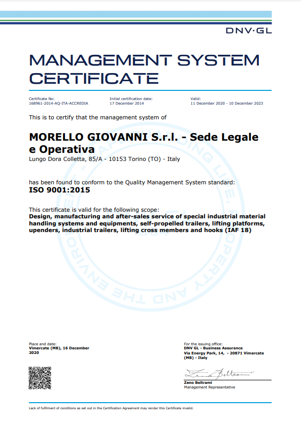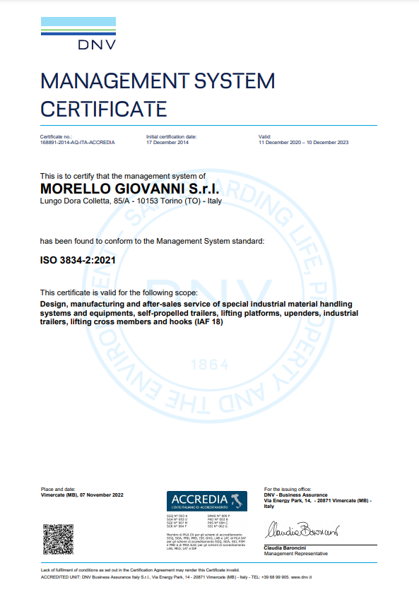 Morello has adopted an integrated management system according to ISO 9001:2015 and ISO 3834-2:2021, which promotes continuous improvement of company processes and products.